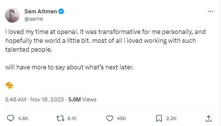 當?shù)貢r間18日,奧特曼在社交平臺表示,“我很喜歡OpenAI的時光,這對我個人來說是變革性的,也希望通過重塑世界帶來一些變革。最重要的是,我喜歡與這些才華橫溢的人一起工作?!?/p>