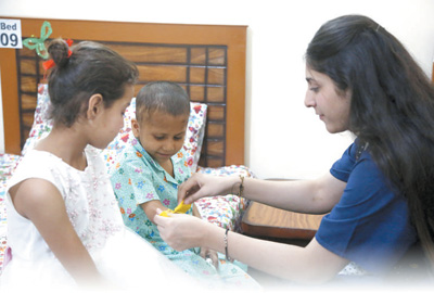 考慮到兒童病患的特殊性,“小家”一直將孩子們的心理疏導(dǎo)作為志愿工作的重點。“孩子們的心理狀態(tài)很重要?!薄靶〖摇卑头截?fù)責(zé)人蘇比婭·阿德南說。阿德南有30多年的兒童公益服務(wù)經(jīng)歷,在她和巴中兩國同事的引導(dǎo)下,孩子們相互鼓勵支持,在閑暇時制作各種手工藝品布置“小家”。