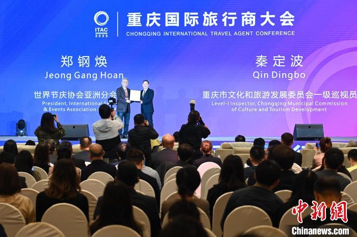 世界節(jié)慶協(xié)會亞洲分會會長鄭鋼煥為重慶市頒發(fā)“2023亞太旅游節(jié)慶城市”獎。中新網(wǎng)記者何蓬磊攝