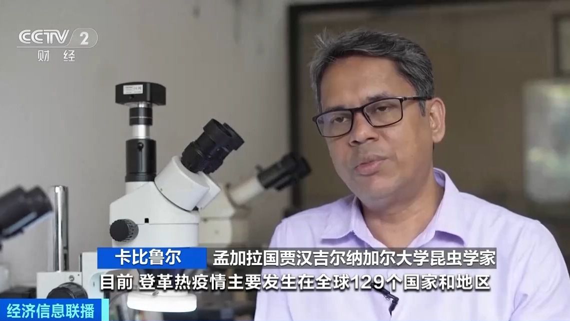 孟加拉國(guó)賈漢吉爾納加爾大學(xué)昆蟲(chóng)學(xué)家 卡比魯爾:目前,登革熱疫情主要發(fā)生在全球129個(gè)國(guó)家和地區(qū),其中大多數(shù)國(guó)家都位于熱帶和亞熱帶,這些國(guó)家容易受到氣候變化的影響。(央視財(cái)經(jīng))