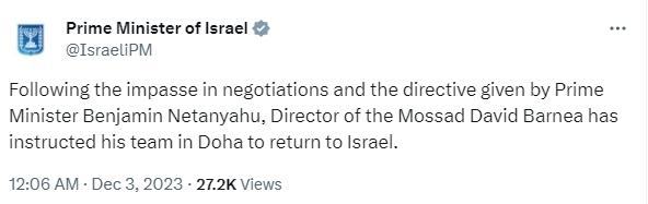 中新網(wǎng)12月3日電 據(jù)卡塔爾半島電視臺(tái)報(bào)道,當(dāng)?shù)貢r(shí)間2日,以色列總理辦公室發(fā)布聲明稱(chēng),以色列已從卡塔爾撤回摩薩德談判代表。