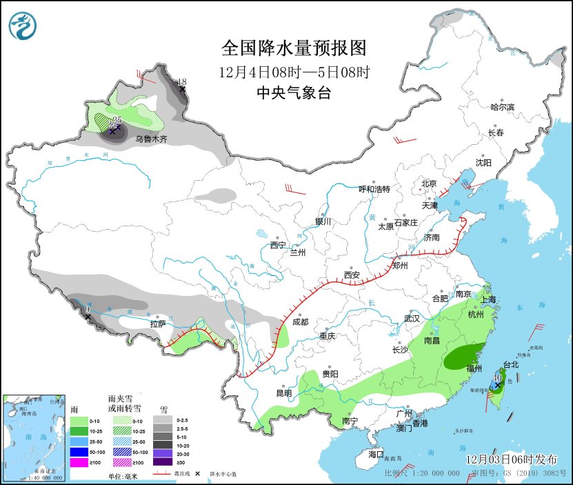 12月4日08時(shí)至5日08時(shí),新疆北部、西藏西南部和東部等地部分地區(qū)有小到中雪或雨夾雪,其中,新疆北疆東部和沿天山地區(qū)、西藏西南部等地部分地區(qū)有大到暴雪,局地大暴雪(20~25毫米)。江南大部、云南東部和南部、華南北部和西部、臺(tái)灣島等地部分地區(qū)有小到中雨,其中,臺(tái)灣島中北部等地部分地區(qū)有大雨(25~40毫米)。內(nèi)蒙古中西部、遼東半島、新疆北部等地部分地區(qū)有4~6級(jí)風(fēng)。