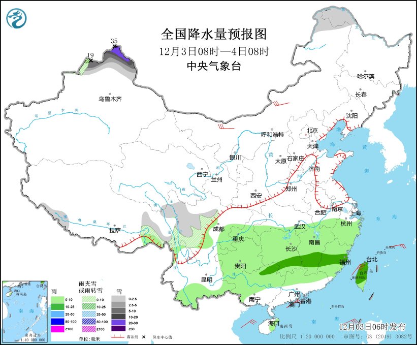 12月3日08時(shí)至4日08時(shí),新疆北部、內(nèi)蒙古東北部、黑龍江西北部、西藏西南部和東部、川西高原等地部分地區(qū)有小到中雪或雨夾雪,其中,新疆北疆北部等地部分地區(qū)有大到暴雪,局地大暴雪或特大暴雪(30~35毫米)。江南、西南地區(qū)東部和南部、華南北部和西部、臺(tái)灣島等地部分地區(qū)有小雨,其中,湖南南部、江西中南部、福建中部、廣西東北部、臺(tái)灣島中北部等地部分地區(qū)有中雨。內(nèi)蒙古中西部等地部分地區(qū)有4~6級(jí)風(fēng)。