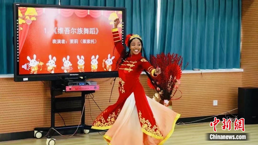 圖為就讀于西北師范大學(xué)的萊索托留學(xué)生茉莉表演維吾爾族舞蹈。受訪者供圖