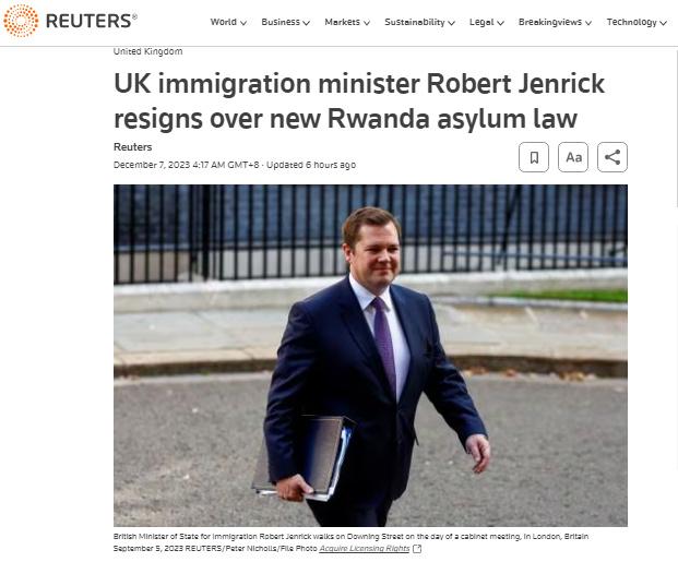 報道稱,詹里克對英國政府當(dāng)日公布的“盧旺達(dá)安全(庇護(hù)和移民)法案草案”持有不同意見。他在一封辭職信中表示,該立法是在2024年英國大選之前解決移民危機的“最后機會之一”。