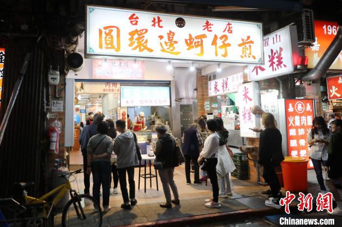 近日,臺北寧夏夜市里的圓環(huán)邊蚵仔煎店,顧客在門口排隊?!≈行律缬浾?陳小愿 攝