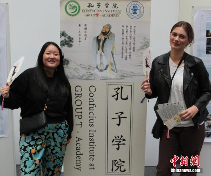 當?shù)貢r間2023年10月19日,比利時魯汶孔子學院舉辦“孔子學院日”活動,魯汶大學學子參與活動,體驗中華文化。圖為兩名青年體驗中國吹墨畫后,揮舞“作品”合影留念。