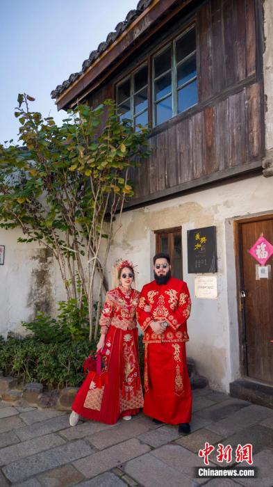 就在不久前,美莎和沙吶沙拍了中式婚紗照,身著紅色秀禾服的美莎選擇與先生在白墻灰瓦的中式園林建筑中留下二人愛情的見證。而兩人的婚禮也頗有戲劇性,雙方父母在土庫曼斯坦家鄉(xiāng)為兩人辦酒,沒能回國的他們則通過視頻遠(yuǎn)程參加了自己的婚禮,接受家人們的祝福。美莎笑稱,她的微信婚禮很特別,很能代表中國速度。