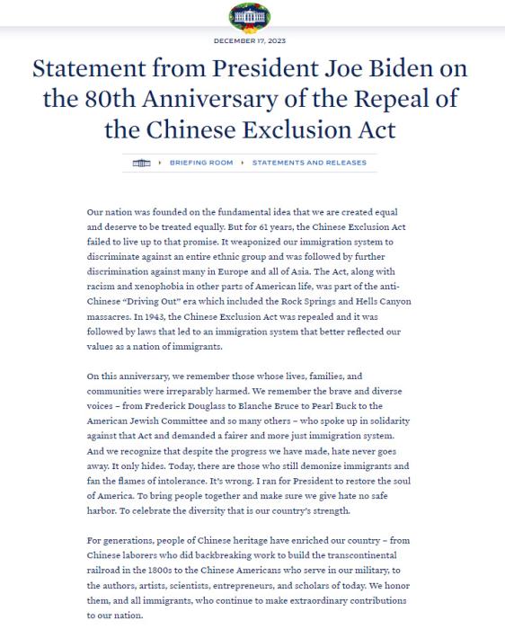 當?shù)貢r間2023年12月17日,薛海培終于等到了白宮的文告。美國總統(tǒng)拜登在文告中指出,“人人生而平等,應(yīng)該受到平等對待”,但《排華法案》與這一理念背道而馳,“它將我們的移民制度武器化,歧視整個種族群體,隨后又進一步歧視歐洲和整個亞洲的許多人?!?/p>