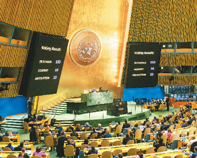 2023年12月12日,聯(lián)合國(guó)大會(huì)緊急特別會(huì)議投票通過(guò)決議,要求在加沙地帶立即實(shí)現(xiàn)人道主義停火。圖為會(huì)議投票現(xiàn)場(chǎng)。