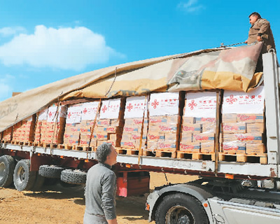 2023年11月27日,在埃及開羅,中國(guó)向加沙地帶提供的人道主義物資裝車等待發(fā)運(yùn)。