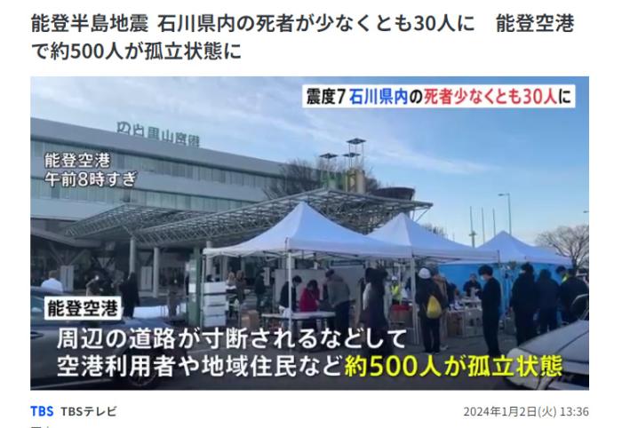 據(jù)報道,包括機(jī)場使用者和當(dāng)?shù)鼐用裨趦?nèi)累計約500人,目前被困于輪島市能登機(jī)場,周圍道路被切斷。