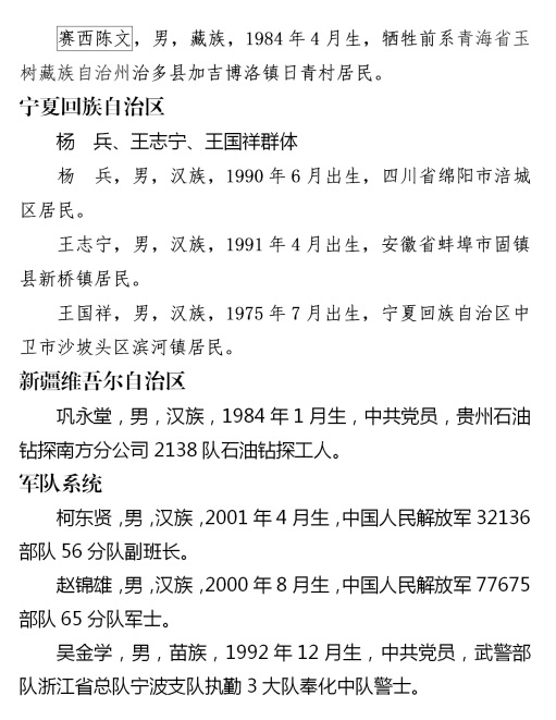 上榜勇士中有勇斗持刀犯罪嫌疑人身負(fù)重傷的張照杰、姚玉龍、王沖、王永芳;有從高橋跳水救人的周中磊、曾文文、周海;有從隨時(shí)可能爆炸的事故車輛中救出司機(jī)母子的湯益鑫;有冒著煤氣罐爆炸危險(xiǎn)制服劫持孩子歹徒的蔡國(guó)榮;有救援被困電梯內(nèi)同事而導(dǎo)致左小腿截肢的翟元敏;有休假期間水下連續(xù)救人的現(xiàn)役軍人柯東賢、吳金學(xué)、趙錦雄;更有見義勇為英勇犧牲的李偉倫、張嘉俊、張可可、李峰武、安西德、何同猛、曾維龍、胡喜明、李振華、東周才仁、賽西陳文11位同志。勇士們見義勇為事跡鼓舞人心、振奮精神、催人奮進(jìn)。他們用血汗甚至生命秉承、詮釋了中華民族傳統(tǒng)美德,用奮不顧身的實(shí)際行動(dòng)踐行了社會(huì)主義核心價(jià)值觀。