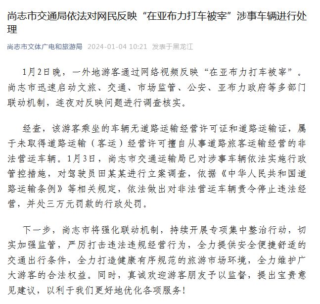 經(jīng)查,該游客乘坐的車輛無道路運輸經(jīng)營許可證和道路運輸證,屬于未取得道路運輸(客運)經(jīng)營許可擅自從事道路旅客運輸經(jīng)營的非法營運車輛。1月3日,尚志市交通運輸局已對涉事車輛依法實施行政管控措施,對駕駛員田某某進行立案調查,依據(jù)《中華人民共和國道路運輸條例》等相關規(guī)定,依法做出對非法營運車輛責令停止違法經(jīng)營,并處三萬元罰款的行政處罰。