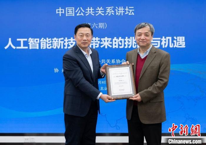 1月8日,中國公共關(guān)系講壇在北京舉行。圖為講壇結(jié)束后,中國公共關(guān)系協(xié)會會長郭衛(wèi)民(左)向演講嘉賓、清華大學人工智能研究院常務(wù)副院長孫茂松頒發(fā)榮譽證書?! ≈袊碴P(guān)系協(xié)會供圖。