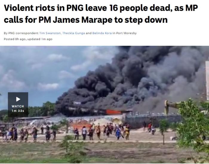 據(jù)澳大利亞廣播公司(ABC)報(bào)道,當(dāng)天,巴新部分民眾利用警察罷工的機(jī)會縱火焚燒商店和企業(yè)設(shè)施,目前騷亂已造成16人遇難,其中首都莫爾斯比港有9人死亡,第二大城市萊城則有7人死亡。