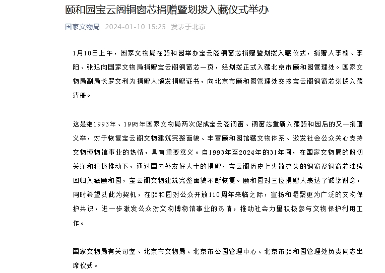 這是繼1993年、1995年國家文物局兩次促成寶云閣銅窗、銅窗芯重新入藏頤和園后的又一捐贈(zèng)義舉,對于恢復(fù)寶云閣文物建筑完整面貌、豐富頤和園館藏文物體系、激發(fā)社會(huì)公眾關(guān)心支持文物博物館事業(yè)的熱情,具有重要意義。自1993年至2024年的31年間,在國家文物局的殷切關(guān)注和積極推動(dòng)下,通過國內(nèi)外友好人士的捐贈(zèng),寶云閣歷史上失散流失的銅窗及銅窗芯陸續(xù)回歸入藏頤和園,寶云閣文物建筑完整面貌不斷恢復(fù)。頤和園對三位捐贈(zèng)人表達(dá)了誠摯謝意,同時(shí)希望以此為契機(jī),在頤和園對公眾開放110周年來臨之際,宣揚(yáng)和凝聚更為廣泛的文物保護(hù)共識(shí),進(jìn)一步激發(fā)公眾對文物博物館事業(yè)的熱情,推動(dòng)社會(huì)力量積極參與文物保護(hù)利用工作。