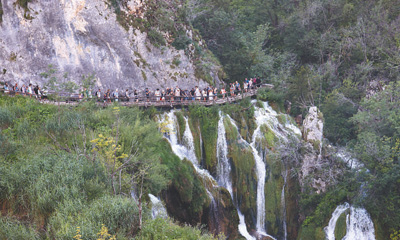 克羅地亞普利特維采湖國家公園是中國九寨溝國家級自然保護區(qū)的“姐妹”自然遺產(chǎn)地。兩者同屬喀斯特地貌,是世界非常罕見的冷水鈣華景觀。中國科學(xué)院成都生物研究所與克羅地亞薩格勒布大學(xué)合作成立“中國—克羅地亞生物多樣性和生態(tài)系統(tǒng)服務(wù)‘一帶一路’聯(lián)合實驗室”,為兩國世界自然遺產(chǎn)地生態(tài)保育作出重要貢獻。圖為當(dāng)?shù)赜慰驮谄绽鼐S采湖國家公園參觀。