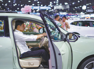 在2023年舉辦的第四十屆泰國國際汽車博覽會上,中國品牌電動汽車訂單量在所有參展品牌中名列前茅。在中國品牌的強勁拉動下,參展電動汽車訂單量首次超越燃油汽車訂單量。圖為當(dāng)?shù)貐⒂^者在車博會上試駕中國品牌電動汽車。