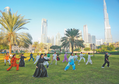 每到周末,世界最高建筑——阿聯(lián)酋迪拜哈利法塔附近的草坪上,一群身穿中式練功服的民眾排成隊(duì)列,伴著舒緩的中國(guó)古典民樂,起勢(shì)、野馬分鬃、白鶴亮翅……如今,越來(lái)越多民眾自發(fā)前來(lái)學(xué)習(xí)太極拳、太極劍、太極扇等,經(jīng)常性參加太極拳練習(xí)活動(dòng)的就有來(lái)自50多個(gè)國(guó)家和地區(qū)的近200人。