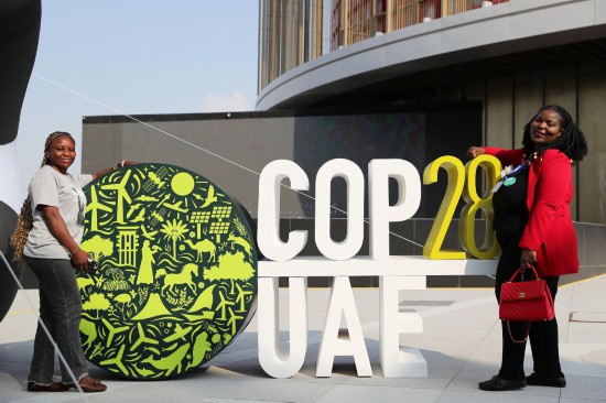 2023年12月3日,人們在聯(lián)合國氣候變化迪拜大會“綠區(qū)”的大會標(biāo)識旁合影。新華社記者王東震攝
