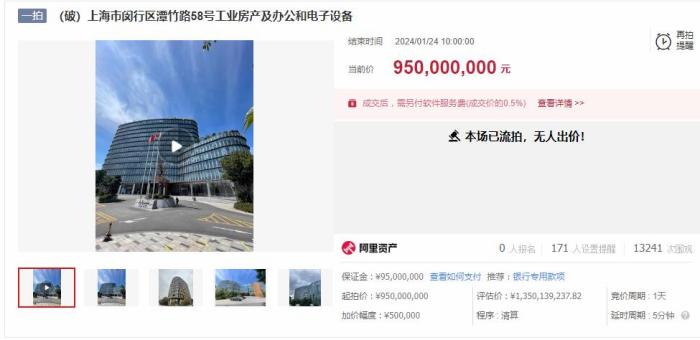 本次拍賣(mài)標(biāo)的評(píng)估總價(jià)約為13.5億元,以9.5億元的價(jià)格起拍,約為評(píng)估總價(jià)的7折。拍賣(mài)于1月23日上午10時(shí)至1月24日上午10時(shí)止,雖然這場(chǎng)拍賣(mài)有超過(guò)1.3萬(wàn)人圍觀,但最終無(wú)人出價(jià),以流拍結(jié)束。