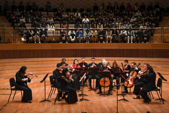 這是2023年11月16日拍攝的音樂會(huì)現(xiàn)場(chǎng)。當(dāng)日,“費(fèi)城之約”——費(fèi)城交響樂團(tuán)與蘇州交響樂團(tuán)室內(nèi)樂音樂會(huì)在江蘇蘇州舉行。新華社記者 李博 攝