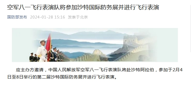中新網(wǎng)1月28日電 據(jù)國防部官方微信消息,應(yīng)主辦方邀請,中國人民解放軍空軍八一飛行表演隊(duì)將赴沙特阿拉伯,參加于2月4日至8日舉行的第二屆沙特國際防務(wù)展并進(jìn)行飛行表演。