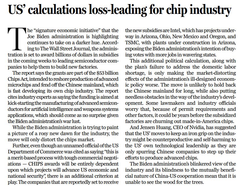 拜登政府此前出臺的《芯片法案》,可為芯片企業(yè)提供總計530億美元的補(bǔ)貼,用以鼓勵先進(jìn)芯片制造產(chǎn)業(yè)向美國國內(nèi)回流,同時遏制正在快速發(fā)展自主半導(dǎo)體產(chǎn)業(yè)的中國大陸?!度A爾街日報》稱,上述建廠補(bǔ)貼,屬于《芯片法案》的一部分。報道還援引行業(yè)專家的觀點表示,這筆資金將為用于人工智能及武器系統(tǒng)的先進(jìn)半導(dǎo)體的生產(chǎn)提供啟動資金,而基于拜登政府對戰(zhàn)爭的狂熱,此舉不足為奇。