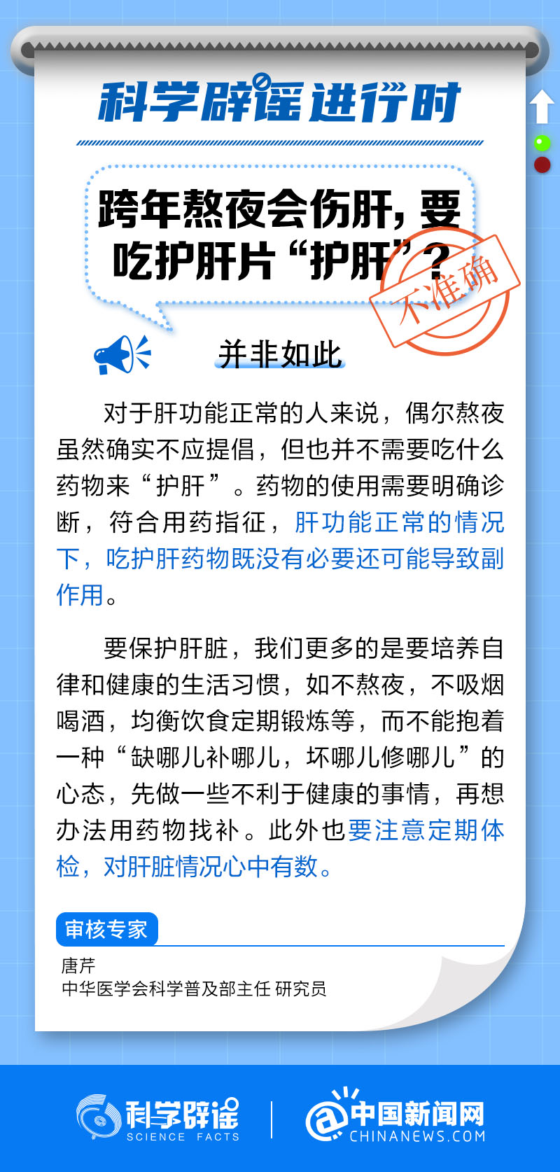 中新網(wǎng)1月30日電 對(duì)于肝功能正常的人來說,偶爾熬夜不需要吃什么藥物來“護(hù)肝”。藥物的使用需要明確診斷,符合用藥指征,肝功能正常的情況下,吃護(hù)肝藥物既沒有必要還可能導(dǎo)致副作用。要保護(hù)肝臟,我們更多的是要培養(yǎng)自律和健康的生活習(xí)慣,如不熬夜、不吸煙喝酒、均衡飲食、定期鍛煉等。(來源:@科學(xué)辟謠 中國新聞網(wǎng)微博 )