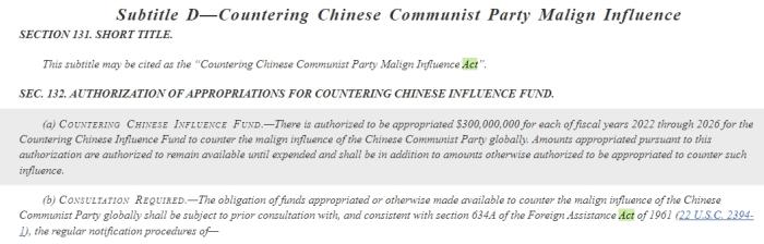 具體內(nèi)容為:“授權(quán)在2022年至2026年的每個財政年度,為‘對抗中國影響力基金’撥款3億美元,以對抗中國共產(chǎn)黨在全球的惡意影響?!?/p>