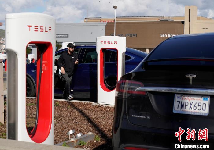 當地時間2月2日,車主在位于美國加州圣布魯諾一處停車場給特斯拉汽車充電。 中新社記者 劉關關 攝