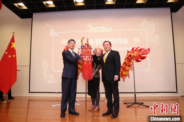 當(dāng)?shù)貢r間2月1日晚,加拿大首都渥太華,中國駐加拿大大使館舉行2024年春節(jié)招待會。圖為中國駐加拿大大使叢培武(左)與加拿大聯(lián)邦參議員胡子修共同為舞龍點睛。中新網(wǎng)記者 余瑞冬 攝