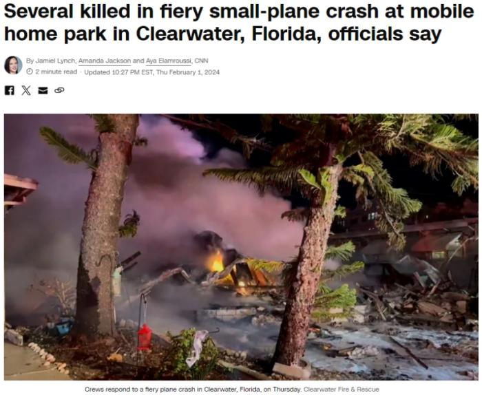 當(dāng)?shù)貢r間2月1日,美國佛州一架小型飛機(jī)墜毀。圖片來源:美國有線電視新聞網(wǎng)(CNN)報(bào)道截圖