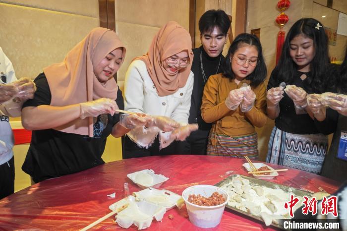 2月3日,廣西民族大學(xué)舉辦留學(xué)生春節(jié)團(tuán)拜會(huì)活動(dòng)。圖為留學(xué)生在包餃子。陳冠言 攝