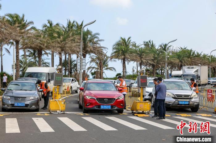 記者5日中午在??谑虚L樂路的小車查驗(yàn)點(diǎn)看到,雙向4車道被改為東往西單向行駛,過海的小車排隊(duì)經(jīng)查驗(yàn)點(diǎn)時(shí),聯(lián)網(wǎng)的攝像頭拍下車牌信息,一旁電子屏馬上就顯示車主所購輪渡的發(fā)船時(shí)間。若發(fā)船時(shí)間在三個(gè)小時(shí)內(nèi),車輛直行直通港口。若超過三個(gè)小時(shí),執(zhí)勤人員引導(dǎo)車輛駛離進(jìn)港通道。