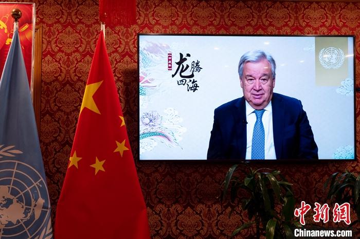 當(dāng)?shù)貢r間2月6日,聯(lián)合國秘書長古特雷斯通過視頻發(fā)表新春致辭,向中國人民和全球華人致以農(nóng)歷甲辰龍年的祝福和問候。圖為中國常駐聯(lián)合國代表團紐約駐地的屏幕播放致辭。 中新社記者 王帆 攝