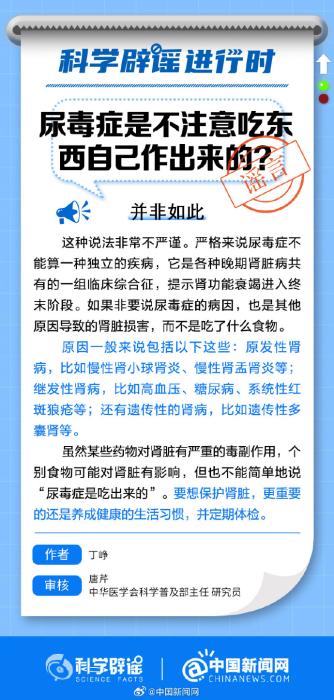中新網(wǎng)2月7日電 近日有人稱:“中國尿毒癥透析患者已經(jīng)超過100萬了,尿毒癥是不注意吃東西自己作出來的,要想不得尿毒癥,有些食物不能碰……”注意,這些說法沒有科學(xué)依據(jù)!嚴(yán)格來說尿毒癥并不能算一種獨立的疾病,它是各種晚期腎臟病共有的一組臨床綜合征,提示腎功能衰竭進(jìn)入終末階段。如果非要說尿毒癥的病因的話,也是其他原因?qū)е碌哪I臟損害,而不是吃了什么食物。要想保護(hù)腎臟,更重要的還是養(yǎng)成健康的生活習(xí)慣,并定期體檢。(來源:@科學(xué)辟謠 中國新聞網(wǎng)微博)