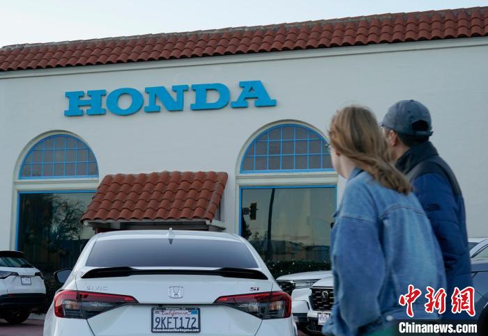 當(dāng)?shù)貢r(shí)間2月6日,行人從美國(guó)加州伯林格姆一家本田汽車銷售店附近經(jīng)過(guò)?!≈行律缬浾?劉關(guān)關(guān) 攝