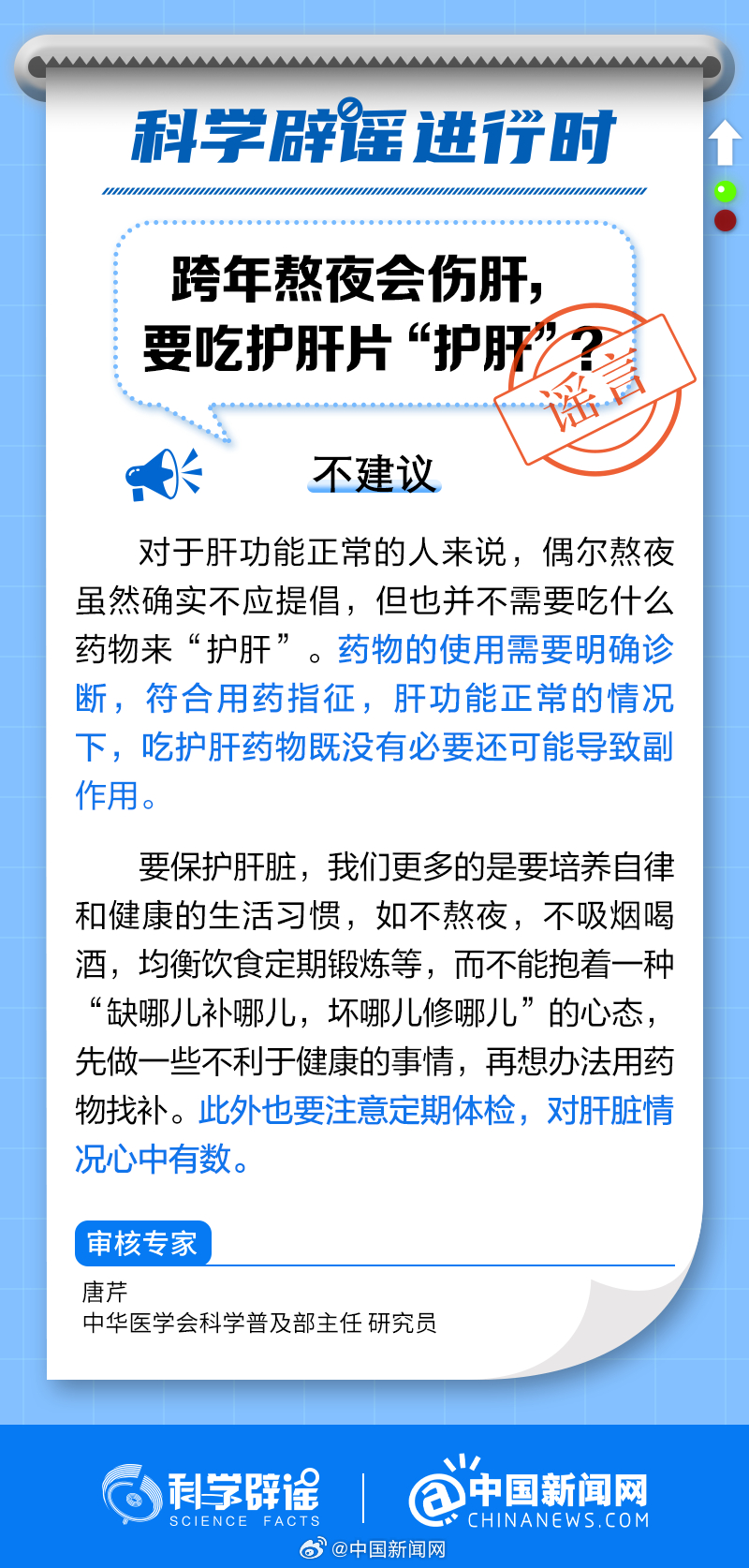 中新網(wǎng)2月10日電 對于肝功能正常的人來說,偶爾熬夜不需要吃什么藥物來“護肝”。藥物的使用需要明確診斷,符合用藥指征,肝功能正常的情況下,吃護肝藥物既沒有必要還可能導致副作用。要保護肝臟,我們更多的是要培養(yǎng)自律和健康的生活習慣,如不熬夜、不吸煙喝酒、均衡飲食、定期鍛煉等。(來源:@科學辟謠 中國新聞網(wǎng)微博)