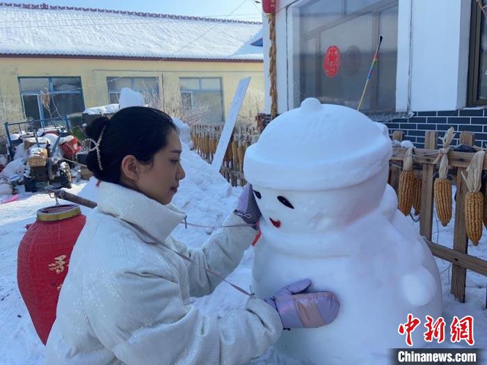 楊家佳在民宿外堆雪人。 楊家佳 供圖