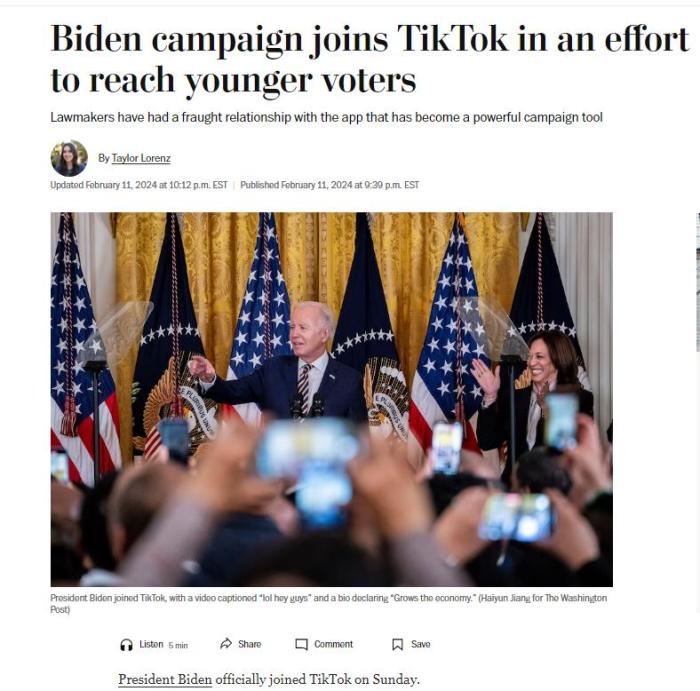 美國《華盛頓郵報(bào)》分析稱,拜登團(tuán)隊(duì)正在努力采取措施來試圖與年輕人建立聯(lián)系。比如,其在TikTok上的頭像是一張眼睛放射激光的照片。對(duì)此,Z世代內(nèi)容創(chuàng)作者亞倫·帕納斯指出:“全國各地的年輕人一直在等待這一刻。”