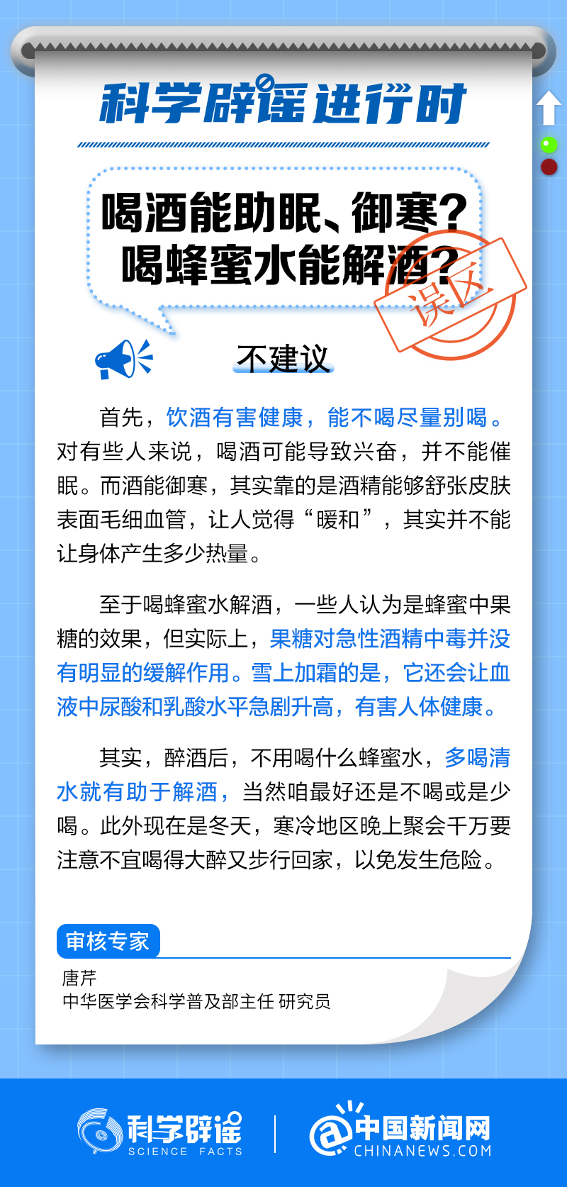 中新網(wǎng)2月13日電 飲酒有害健康,能不喝盡量別喝。對有些人來說,喝酒可能導致興奮,并不能催眠。而酒能御寒,靠的是酒精能夠舒張皮膚表面毛細血管,讓人覺得“暖和”,其實并不能讓身體產(chǎn)生多少熱量。至于喝蜂蜜水解酒,一些人認為是蜂蜜中果糖的效果,但實際上,果糖對急性酒精中毒并沒有明顯的緩解作用。它還會讓血液中尿酸和乳酸水平急劇升高,有害人體健康。(來源:@科學辟謠 中國新聞網(wǎng)微博 )