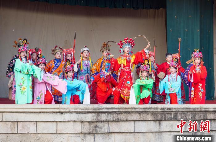 資料圖:安徽省宣城市績(jī)溪縣伏嶺鎮(zhèn),徽戲童子班的演員們?cè)趹蚺_(tái)上表演。 張雨生 攝