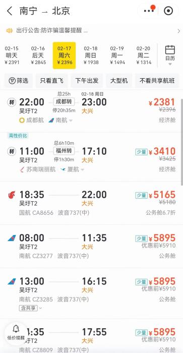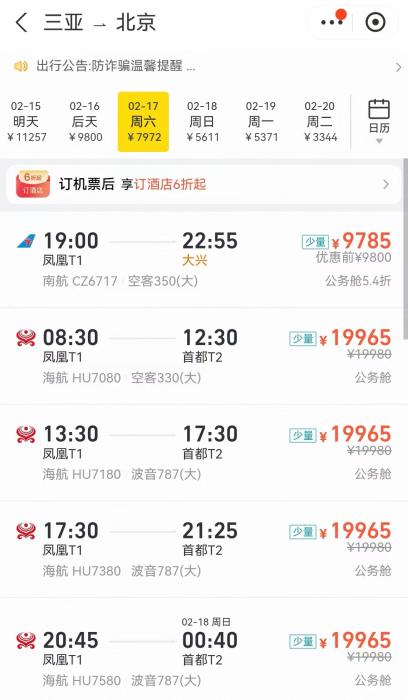 另外,如果條件允許,錯峰返程也是個好辦法。例如,從哈爾濱到北京,17日機票最低需要6000多元,但如果選擇19日回,機票價格降到1500元左右,直接省下4000多元。同樣的情況也發(fā)生在哈爾濱到上海、三亞到重慶等航線上。