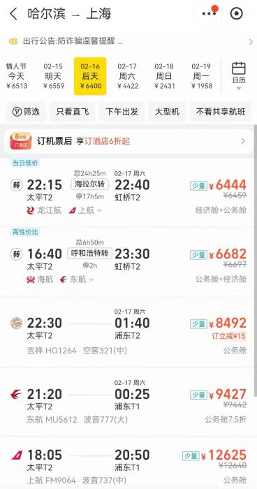這個冬天,“爾濱”出圈,帶動東北旅游熱。16日至17日,從哈爾濱、沈陽直飛北京、上海的機票只剩高價公務艙,長春直飛這兩大目的地的機票僅余少量經濟艙。其中,哈爾濱飛往上海的部分公務艙價格已經上萬,哈爾濱飛往其他熱門目的地的機票價格也動輒五六千元。