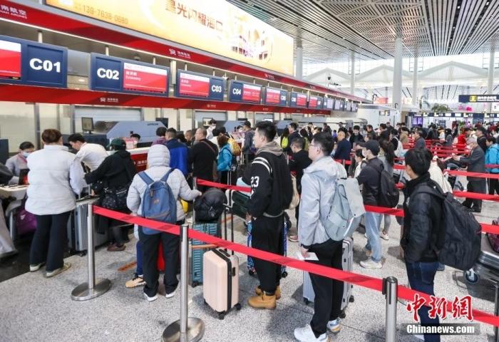 2月8日,海南???,旅客在海口美蘭國際機場T2航站樓排隊辦理值機。春節(jié)臨近,??诿捞m國際機場客流攀升。中新社記者 駱云飛 攝