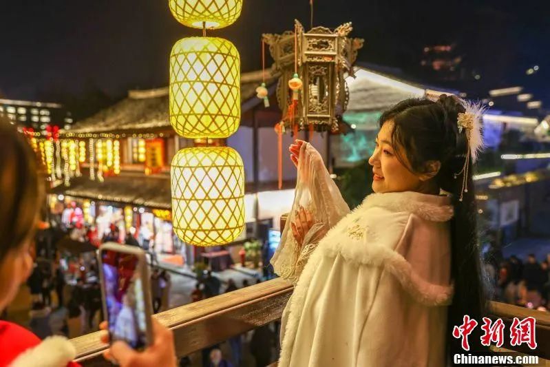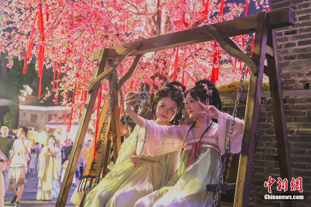 圖為夜幕降臨時,民眾們在江南宋城歷史文化街區(qū)中游玩。劉力鑫 攝
