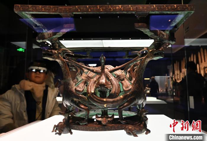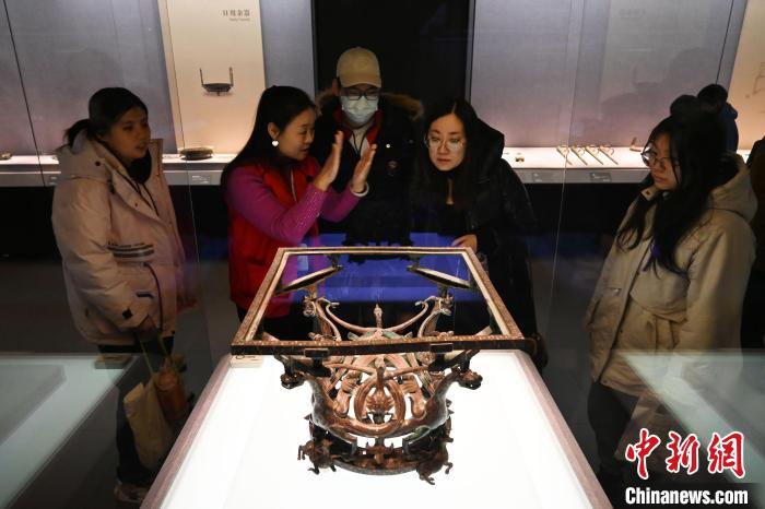 2月6日,民眾在河北博物院“戰(zhàn)國雄風(fēng) 古中山國”展廳參觀錯(cuò)金銀四龍四鳳銅方案座?!≈行律缬浾?翟羽佳 攝