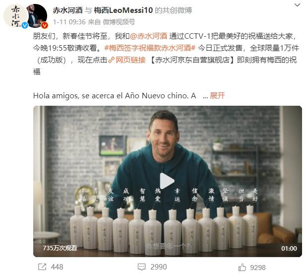 1月11日,梅西發(fā)博官宣牽手赤水河酒。梅西個人微博發(fā)文稱,梅西簽字祝福款赤水河酒當日正式發(fā)售,全球限量1萬件,并配上了一段梅西為酒瓶一一簽名的宣傳視頻。